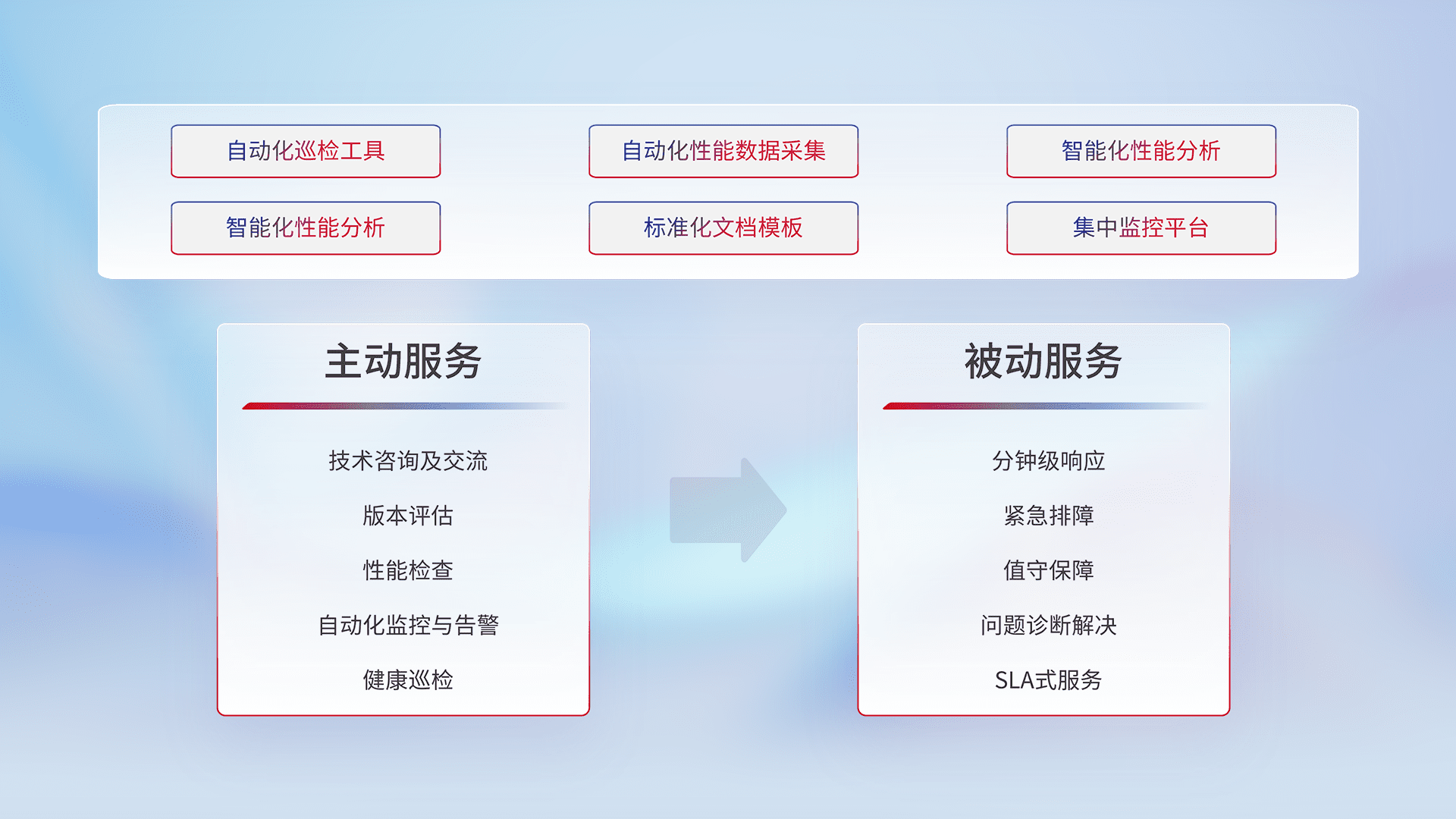 智能化工具和标准化文档,,保障服务质量,,,,提供主动服务(包含技术咨询、、版本评估、、、、性能检查、、自动化监控与告警、、健康巡检)和被动服务包含(分钟级响应、、、紧急排障、、值守保障、、、问题诊断解决、、SLA服务)。。